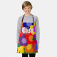 El delantal de los niños tiene flores y hojas por todas partes en azul, rosa, rojo, naranja, amarillo y verde azulado.