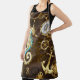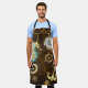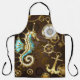 Fondo de madera marrón con mar, cresta mecánica, volante antiguo, ancla dorada y varios engranajes de oro y latón. Estilo Steampunk.