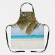 Escena tropical de playa con palmeras inclinadas, arena y océano azul acuático. Esto se hace a partir de una fotografía representada artísticamente y que se hace parecer más a una pintura.
