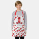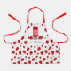 Un delantal con un frasco sonriente de mermelada de fresa. Este ilustracion personalizado tiene fresas en ambos lados. Debajo del dibujo están las palabras "¡Esta es mi mermelada!". El delantal tiene un patrón de fondo de fresas rojas.