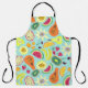 Este elemento es un delantal con fondo verde claro. Tiene correas negras y el delantal tiene un diseño con frutas y verduras.
