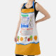 Un delantal colorido, con gráficos de una tabla de conversión de cocina, con naranjas, hongos y pimientos coloridos, en el fondo. Gran idea de regalo para cualquier cocinero.