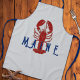 Delantal de langosta con texto 'Maine'. Una gran langosta roja está vertical en un fondo gris plateado con letras azul oscuro. Este delantal largo es perfecto para hombres a los que les encanta cocinar. El diseño también se transfiere bien al delantal más corto y al tamaño para niños. El texto se puede eliminar fácilmente o cambiar a algo que se ajuste al espacio. Un ejemplo sería 'Papá' o un nombre más corto.