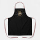 Delicado, moderno, elegante, minimalista delantal negro y dorado con monograma personalizado y nombre en guion. Con una inicial de monograma y una firma femenina en una fuente de caligrafía manuscrita con colas de florituras y un marco de círculo punteado alrededor de tu nombre. Regalo femenino perfecto para mamá, novia, cumpleaños y cualquiera que ame el estilo simple moderno.
