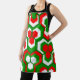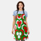 Este delantal tiene un diseño geométrico Navidad de hexágonos en conjuntos de tres que parecen flores en rojo, blanco y verde.