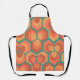 Este delantal tiene un diseño geométrico de hexágonos en conjuntos de tres que parecen flores en oro, naranja y rojo en un campo de verde azulado.