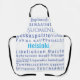Los principales monumentos, parques e islas de Helsinki, la capital de Finlandia, y un bien guardado destino de vacaciones secreto. Tipografía en azul y oscuro, así como en azul y blanco de la bandera finlandesa. ¡Un delantal para inspirar recetas nórdicas!