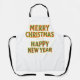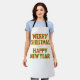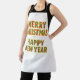 Fun festive apron with "Merry Christmas and a Happy New Year "on it. Lettering in a cheery red and green geometric pattern outlined in gold. Makes a great hostess gift for the cook when getting together with family or friends.