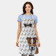 El original ilustracion personalizado de Destei de un perro de raza Jack Russell Terrier de color marrón y blanco / blanco y tostado. El diseño del perro se coloca como un patrón en el fondo del delantal así como un retrato de cabeza más grande en el fondo. La parte superior tiene una silueta de hueso de perro negro junto con un área de texto personalizable para un nombre.