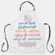 El trabajo artístico original de ZoeSPEAK en este delantal es para cualquiera que ame cocinar, cualquiera que sea el chef de cocina en casa. En la parte superior hay una foto de un sombrero clásico de chef blanco, seguido de las palabras para Jefe de Cocina, jefe de la cocina, en cinco idiomas diferentes: holandés, alemán, español, italiano y francés. Cada idioma está en un color diferente: azul oscuro, verde, naranja, rojo y azul medio. A continuación, en la parte inferior del diseño, hay una descripción del término "chef de cocina": ‘Chef de cocina ) chef de cocina; literalmente "jefe de cocina") es responsable de la gestión general de la cocina; supervisa al personal, crea menús y nuevas recetas, realiza compras de alimentos, capacita a los aprendices y mantiene un entorno sanitario e higiénico para la preparación de alimentos.