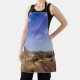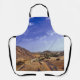 Una impresionante vista panorámica de un majestuoso paisaje árido, con montañas escarpadas de color ocre y un característico pico cónico bajo un vibrante cielo azul salpicado de nubes blancas. Una carretera serpentea a través del valle, donde la vegetación escasa da un toque de vida al terreno, que por lo demás era estéril, destacando la cruda belleza del medio desértico.