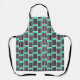 Este delantal tiene un diseño moderno de mediados de siglo, compuesto por cinco líneas negras y dos rectángulos turquesa que se repiten a lo largo del diseño.