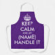 Mantente tranquilo y deja que (nombre) se ocupe de su divertido delantal morado de barbacoa para hombres y mujeres. Plantilla moderna de tipografía con corona. Parones de cocina personalizados de cualquier color. Plantilla de moda con diseño de tipografía de letras grandes. Añade tu propio nombre o cita humorística. Crea tu propio regalo de cumpleaños para el maestro de la parrilla, mamá, papá, hermana, hermano, padre, madre, esposa, esposo, amigo, tío, tía, novio, novia, abuela, abuelo, hijos, jefe, compañero de trabajo, cocinero, colega, entrenador, profesor, enfermera, pareja de bodas, etc. Disponible en tamaño pequeño, mediano y grande. También es ideal para fiestas de la cena, horneado, lavado de platos, trabajo de arte y artesanía, etc. Hagan un suyo y el suyo para él y para ella. Humor para amigos y familiares.
