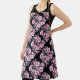 Este gráfico floral, se muestra en un patrón diamantífero, con grupos de flores, pétalos y hojas, en colores mudos; rosa, fuschia, lavanda, malva, verde y blanco - contra un fondo de negro.
