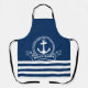 Esta imagen muestra un nombre de barco y un ancla sobre un fondo de rayas azul marino y blanco.
