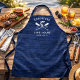 El delantal de la casa de lago de la familia impresa tiene remos cruzados y un pez que salta sobre un fondo de madera azul marino, con el nombre de la familia, la ubicación del lago y fecha establecida tan fácil de personalizar plantillas de texto.
