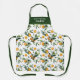 El delantal, vibrante y veraniego, presenta un patrón de flores de naranja cítrico y hojas en la paleta alegre de naranja, blanco y verde vivo, con su propio nombre y su propio papel de cocina o trabajo.  Ideal para la barbacoa al aire libre o para el almuerzo o la cena en el jardín.