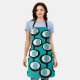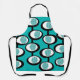 Este delantal tiene un diseño moderno de mediados de siglo de líneas que hacen que los círculos dentro de ovales se unan en turquesa, negro y blanco.