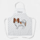 El original ilustracion personalizado de Destei de un perro de raza Papillon color abrigo rojo y blanco. También hay un área de texto personalizable para un nombre. El fondo tiene un patrón de huellas de perros grises. El color gris del patrón de impresión de la pata de perro puede cambiarse a cualquier otro color, si así lo desea.