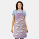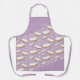 Un delantal con un patrón de donuts sonrientes con rociadas. El delantal incluye la palabra "Donuts" y esa palabra se puede personalizar a un nombre, otra palabra o frase corta. El color principal es el violeta y el blanco.