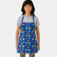 Un delantal con un patrón de personalizados de tiburones divertidos, multicolores, de fondo azul. El delantal incluye un nombre de personalizable en letras blancas.