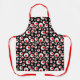 Este delantal de la cocina tiene un patrón abstracto de círculo geométrico de bolas rojas con bolas blancas más grandes diseminadas sobre un fondo negro.