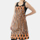 Este diseño de delantal es una divertida mezcla de patrones de otoño. El patrón principal está formado por rayas, mientras que los bordes superior e inferior están compuestos por un patrón de argyle. Los colores son negros, naranjas y blancos.