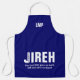 Sencillo delantal cristiano blanco y azul con tipografía rosa profunda que lee JEHOVAH JIREH, basado en el versículo de la Biblia de Génesis 22:14. El 'Jehová' se sitúa verticalmente dentro de la J de 'Jireh'. En la parte superior hay un monograma de marcador de posición. En el fondo hay un popular proverbio checo - 'El Dios que nos dio dientes también nos dará pan'. Este texto es PERSONALIZABLE, por lo que puede personalizar con su nombre o la redacción de su elección (o borrar). Hay otros colores disponibles.