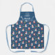 El delantal azul dulce que combina la familia con un patrón divertido con encantadores personalizados de nieve con pañuelos rojos y pañuelos y gorras rojos y negros, y adorable y pequeño Santa Clauses, decorado con copos de nieve, hojas verdes y rojas y latas de dulces rojos y blancos. En la parte superior, la leyenda, decorada con un estilizado susurro y un alfiler, se lee al chef con letras blancas y se personalizable con tu nombre.