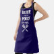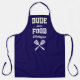 The perfect apron for the guy who loves to grill. Two crossed spatulas appear silhouetted in white under the words "Dude with the Food" in white on a navy blue background. Personalize it with his name in retro script. Makes an ideal birthday or Father's Day gift.