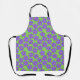 Este delantal tiene un diseño primaveral de un campo de flores periwinkle sobre un fondo verde.
