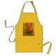 Un delantal amarillo alegre para cultivar un huerto o cocinar con pimientas coloridas en fondo anaranjado.