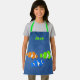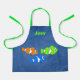 Delantal de cocina para niños o niñas con diseño submarino. Fondo de agua azul con tres peces payaso y nombre del niño en verde brillante en la parte superior. Peces a rayas naranjas, azules y verdes nadan a través de este divertido delantal para niños que aman hornear y cocinar.