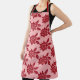 Fondo rojo claro con repetidos patrones de puninsettia roja, correas rojas oscuras.