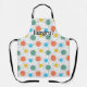 Este delantal tiene un diseño moderno de mediados de siglo de círculos con líneas en naranja, amarillo, turquesa y verde.