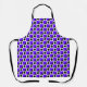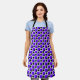 Apron with a purple and black geometric pattern displayed on a plain background. The model wears it over a light blue shirt, smiling warmly.