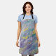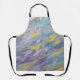 Quiet Reign is an abstract piece defined by its soothing, cool color palette and energetic brushwork. The painting features diagonal sweeps of soft lavender, tranquil aqua, and deep violet, punctuated by bold, shimmering metallic gold accents. The overall effect is one of serene motion, like a gentle rain shower illuminated by a hidden golden light. This artwork adds a touch of modern, peaceful sophistication to any space or product.