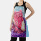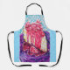 A slice of cake topped with vibrant red raspberries drips with rich sauce onto a dark purple plate. The background features a blue lattice pattern, complementing the dessert's vivid colors.
