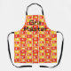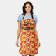 Este delantal tiene un diseño moderno de mediados de siglo de rectángulos apilados tres gruesos en colores cálidos de rojo, naranja, oro y amarillo sobre un campo de blanco. ¿Quieres el mismo diseño con colores diferentes? Mándame un mensaje.