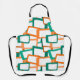 Este delantal tiene un diseño moderno de mediados de siglo de rectángulos sesgados con agujeros blancos en tonos verde azulados y tonos naranjas.
