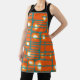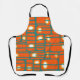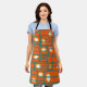 Este delantal tiene un diseño moderno de mediados de siglo de rectángulos naranjas con círculos blancos y dorados y líneas horizontales verde azuladas que los atraviesan en un campo de verde azulado.