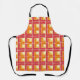 Este delantal tiene un diseño geométrico de L's en rojo, naranja y amarillo, colocado en diferentes direcciones sobre un campo de blanco.