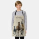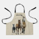 Horses bib apron for girls with her name at the top. Dark tan color with three horses running side by side. Name is printed in black, thin letters across the top.