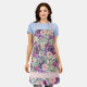 Un delantal lindo y ondulado, con flores color agua morado y rosa y hojas verde salvia impresas. El texto dice "Tu cocina" Personaliza con tu nombre o cualquier texto que elijas.