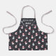 Un divertido delantal gris oscuro para los niños con un bonito patrón con unos adorables hombres de nieve con pañuelos rojos y azules claros y gorras rojos y negros, decorado con copos de nieve. En la parte superior, la leyenda, decorada con susurros estilizados y alfileres, dice Sous Chef con letras blancas y personalizable con el nombre del niño.