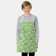 Un delantal verde divertido para los niños con un adorable patrón con unos adorables hombres de nieve con bufandas rojas y azul claro y gorras rojos y negros, decorados con copos de nieve. En la parte superior, la leyenda, decorada con susurros estilizados y alfileres, dice Sous Chef con letras blancas y personalizable con el nombre del niño.