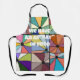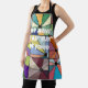 Este delantal tiene un diseño abstracto hecho de nueve cuadrados con un círculo y "rayos" que salen del círculo en muchos colores diferentes.