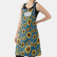 "Sunflowers Blue Rustic Farm House Kitchen Name, por todo el patrón de delantal". Pintura original de los girasoles de diferentes tamaños con círculos y puntos en un patrón con fondo azul audaz. Personaliza con tu nombre o mensaje. Arte pintado por la artista y diseñadora con licencia internacional Audrey Jeanne Roberts, copyright.