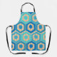 Este delantal tiene un diseño geométrico de hexágonos en cuatro tonos azules sobre un campo de rayas de color marrón en dos tonalidades.