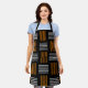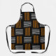 Este delantal tiene un diseño moderno de mediados de siglo que parece un tejido con líneas naranjas y blancas en un campo de negro.